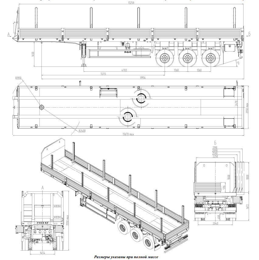 Технические характеристики • Снаряженная масса, кг 9800 • Масса груза, кг 34200 • Полная масса, кг 44000 • Нагрузка на шины, кг 27000 • Нагрузка на седельно-сцепное устройство, кг 17000 • Подвеска пневматическая • Шины / количество 385/65 R 22,5 / 6+1 • Сцепной шкворень 2 дюйма